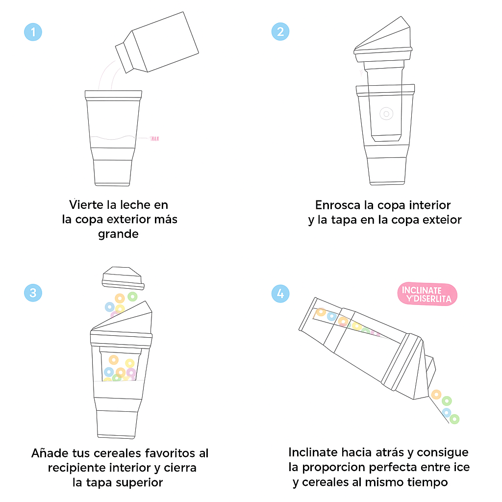 - Diseño de doble vaso: uno para la leche y otro para los cereales.